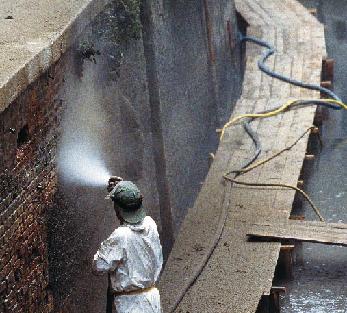 A masonry wall structure that supports the fondamenta along the canal, resting on wood pilings.